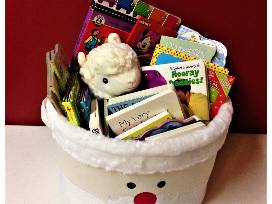 White Santa basket stuffed with many books for young children and an adorable stuffed lamb. Also included here is a $10 Half Price Books gift card & a $10 Granger Community Church Bookstore gift card.