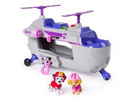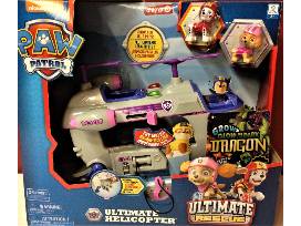 Take to the sky with the Paw Patrol Ultimate Rescue Helicopter! This helicopter is equipped with a moving propeller, flip-down handle and extendable rescue hook! With room for all 6 pups (Skye & Marshall are included) on board, the PAW Patrol is ready for a ruff, ruff, rescue! Open the back door to load in the pups, then place Skye and Marshall in the cockpit and lift off. Pull on the pink lever and you'll activate the rotating propeller, flashing lights and realistic helicopter sounds. Also included here is a Grow & Glow in the Dark Dragon figure.