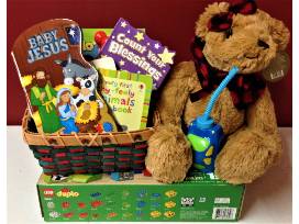 My First Emotions Duplo set, a cuddly stuffed bear, a small water bottle, and a basket full of books. Also included are two $10 Granger Community Church Bookstore gift cards.