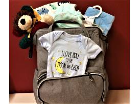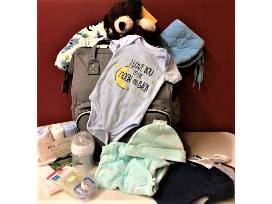 Gray diaper bag backpack filled with many adorable items for your baby boy - teddy bear, 5 onesies, sleeper & cap, changing pad, blanket, 5 cloth diapers, 4 wash cloths, newborn bottle and 2 pacifiers.