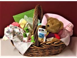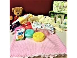 Many items to welcome your baby girl into the world - handmade pink blanket, teddy bear, play outfit (6-9 mos), onesies (6-9 mos), pajamas (9 mos), sweater (6-12mos), 6 wash cloths, bath care set, baby bottle, 3 snack bowls, and 2 pacifiers.