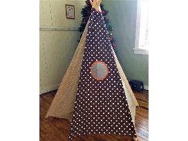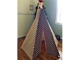 Handmade cloth teepee in beige, brown, and polka dots with wooden supports. Your kids will love playing in here and peeping out the door and window!