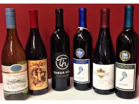 6 varied bottles of wine in a lovely wood & metal rack - 2013 Francis Ford Coppola A Tavola! Petite Sirah, 2017 Kendall-Jackson Vintner's Reserve Syrah, 2018 Oyster Bay Sauvignon Blanc, Tabor Hill Classic Demi-Red, 2014 Barefoot Merlot, and 2016 Barefoot Malbec. Also included is a Merlot Christmas ornament.