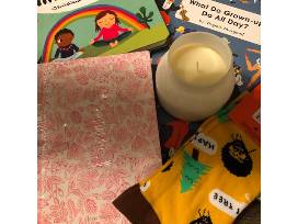 And a variety of gifts from Meier's Pharmacy (2 Childrens books, 1 volcano candle, a journal, socks)