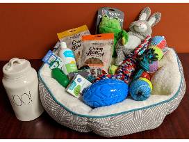 Spoil your fur baby with this fun collection of dog accessories! Includes treats, treat jar, dog bed, shampoo, toys and more.