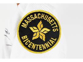 Replica jersey from 1976 season featuring Massachusetts bicentennial patches and personally autographed by Hall of Fame legend Bobby Orr.