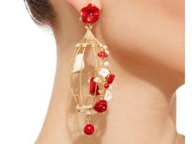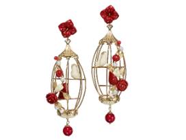 - These romantic earrings feature two lovebirds perched in a gilded cage decorated with a decadent trellis of blooming flowers. Handcarved by master carvers in Italy, they are made from natural and composite coral, chalcedony, agate, horn and pearl, and set 18 kt yellow gold vermeil.