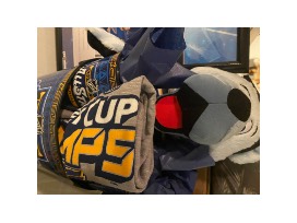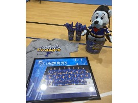 Blues popcorn tub, 2 tumblers, large Louie, Framed 2019-2020 Lineup and shirt