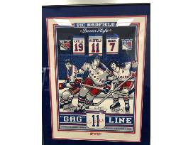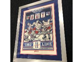 This package includes a custom 18" x 24" "GAG Line" framed poster autographed by the GAG line on Vic Hadfield Night, December 2nd, 2018. This is #16 of 250 autographed posters made available after Vic Hadfield's banner raising ceremony. The GAG Line consists of Rod Gilbert, Jean Ratelle, and Vic Hadfield.