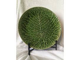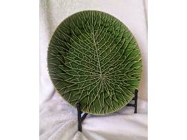 14in. Round serving platter + stand - perfect for your next meal. Gorgeous green color with leaf-carved look.