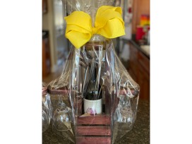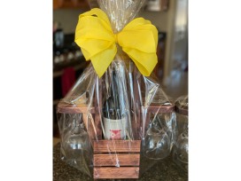 Set of two wine caddy's each with a bottle of wine and two wine glasses.