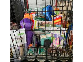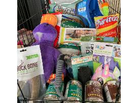 20 x 30 Dog crate, Shreadproof memory foam pet bed, NutriSource dry dog food, KONG large duck toy, Buck Bone organic dog treat, GEO Play textured dog ball, Skid Stop slow feed bowl, Zeus Better Bones Mimi dog treats, Ocean Breeze soy wax candle, Tall Tails leash, NutriSource grain free soft dog food, Zippy Paws pick up bag dispenser, Pal Pak Harness, Nupro all natural dog supplements and a gift certificate for $145 good for 5 days boarding or daycare at AmeriPet!