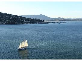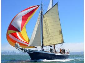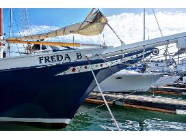 Berthed in beautiful downtown Sausalito, the Schooner Freda B is the finest sailboat for hire on the San Francisco Bay. She is a stable, 80-foot sailboat that is certified by the Coast Guard to accommodate up to forty-nine passengers. Our guests enjoy all the upright comforts and hospitality of a motor yacht while sailing on a traditional, gaff-rigged schooner.