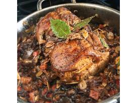 Pork Adobo - braised pork belly with black garlic, broccoli rabe, yukon potatoes, and