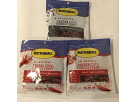 Insulated bag with beef jerky, Butterball Turkey Strips, and beef snack sticks