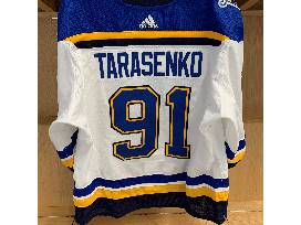 Bid on #91 Vladimir Tarasenko's set 1 road jersey from the 2019-20 regular season. This jersey was locker-room issued for all road games from October 26, 2019 until December 10, 2019, and this jersey was NEVER worn. This jersey features the "All-Star patch" on the right shoulder