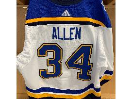 Bid on #34 Jake Allen's set 1 road jersey from the 2019-20 regular season. This jersey was worn in all road games played in from October 7, 2019 until December 10, 2019. This jersey features the "All-Star patch" on the right shoulder.