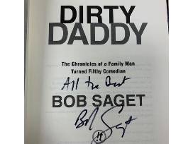 "Dirty Daddy - The Chronicles of a Family Man Turned Filthy Comedian" book by Bob Saget signed "All The Best Bob Saget." Millions of viewers know and love Bob Saget from his role as the sweetly neurotic father on the smash hit Full House, and as the charming wisecracking host of America's Funniest Home Videos. And then there are the legions of fans who can't get enough of his scatological, out-of-his-mind stand-up routines, comedy specials, and outrageously profane performances in such shows as HBO's Entourage and the hit documentary "The Aristocrats." In his bold and wildly entertaining publishing debut, Bob continues to embrace his dark side and gives readers the book they have long been waiting for-hilarious and often dirty yet warm and disarmingly sincere. Hard cover book with jacket in good condition, small bends in jacket at the edges of spine. MPAC is not responsible for any damage that could occur in transit or upon removal from packaging by the recipient. Value represents Fair Market Value unsigned. Certificate of Authenticity unavailable.