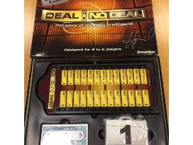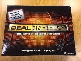 Play the hit TV Game Show at home! Signed by host, Howie Mandel, this board game version of Deal or No Deal is for 2 to 6 players and is fun for the whole family! Includes display with open and close windows, stand, 26 suitcases, play money, value cards, player cards and instructions. All game pieces are unopened. The edges and corners of the box are frayed and there are some dents in the bottom of the front of the box. Certificate of authenticity not available. Value represents Fair Market Value unsigned.