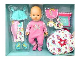 Your little one can welcome Bitty Baby home with all the essentials for pretend play. This set features the 15" Bitty Baby doll in her diaper and sweet sleeper. She comes with a tunic top with pink ruffled accents, a pair of comfy leggings, a bib, a hat, a flower rattle for playtime, a bottle, a soft blanket, and a pair of booties, plus a zippered carrier for taking Bitty Baby's things on the go. 12 pieces in all. Ages 3+