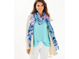 Great gift for the Lilly Pulitzer lover in your life! Gift bag includes two gold embossed stemless wine glasses and beautiful super soft tassel scarf.