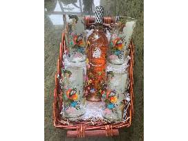 Gift basket including a set of (4) One-of-a-kind, limited edition, upcycled flower glasses and a bottle of Rose.
