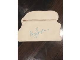 Uniquely shaped leather clutch bag with image on the front and contrasting zipper as well as Ashley's Signature on the back.