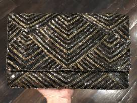 Gear up for next Saints season with a beaded black clutch & black and gold hanging earrings from local boutique, Zoveaux on Metairie Road!