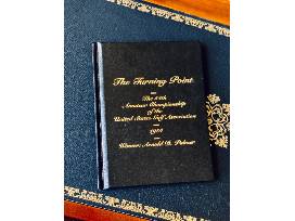 This 2004 edition of The Turning Point: The 54th Amateur Championship of the United States Golf Association - 1954, is autographed by Arnold Palmer himself. It commemorates the 50th anniversary of his infamous victory at the 1954 US Amateur Championship. Nicknamed The King, he turned professional after the win and went on to claim four Masters Green Jackets as well as many other victories. Book is bound in black leather with gold lettering on the cover with an introduction from Phil Mickelson.