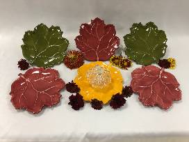 Welcome Fall with these 12 adorable PRE-LOVED autumn leaf salad plates in autumn colors, a stunning NEW art glass pumpkin from the Morris County School of Glass gallery, 2 white ceramic serving platters, an acorn shaped tray & NEW table runner by Vintage House.
