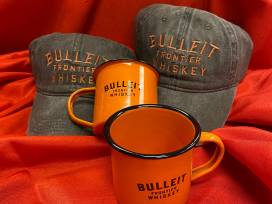 - Two Bulleit Bourbon baseball hats and tin cups.