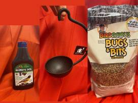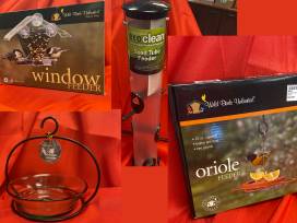 - Assorted Bird Items from Wild Birds Unlimited: 44" Corinthian bell chime, large tube feeder, Cuban glass bird bath, window bird feeder, oriole bird feeder with food, bag of bugs & bits feeder food.