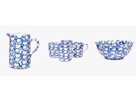 Tory Burch Spongeware pitcher with four matching mugs and large serving/fruit bowl. Hand-painted stoneware in blue smoke ring pattern.