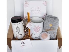 GIFT CONTENTS: Full size artisan black loose tea leaves in Darjeeling flavor, large 15 ounce ceramic custom printed mug with the phrase, "tea makes everything better," blue-grey super soft cozy fluffy socks with gold heart embroidery, two organic manuka honey sticks - the perfect addition to your mug of tea!, stainless steel metal spring-release tea infuser for use with loose leaf teas, and an extra large 5oz handmade bath bomb in a soft oatmeal, milk, and honey scent.