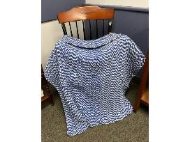 A cozy blue and white hand knitted blanket by