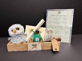 Plush owl, potion bottle, polished "wand" stones, handmade one-of-a-kind wand, and a gift certificate for $50 off summer 2022 tuition for