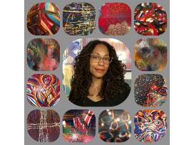 Her media include acrylics and spray paint on canvas, as well as leather. Her paintings have been described as bold, often tribal, with intense color, emanating power and freedom.