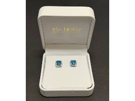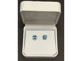 One pair of blue topaz and diamond earrings each containing 1 (one) 7x7mm Swiss blue, antique square, checkerboard-cut blue topaz. Surrounded by 20 (twenty) round full cut diamonds measuring on average 1mm in diameter with an extimated total weight of .20 cts. (the weight is for both earrings)