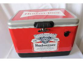 Just in time for the spring and summer outdoor activities and events, this 54 QT retro Budweiser logo steel belted chest Coleman cooler from H.W. Herrell Distributing Co. even has the classic Budweiser Bowtie logo on the lid and bottle opener on the front.