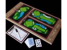 This Across the Board Golf Game is played by rolling the die for tee shots and drawing a card for approach shots toward the green. All players keep score on the provided scorecard. Side games and wagers are included to add even more action. It comes complete with a deck of cards, a die, four metal golf ball tokens, dry erase marker and dry erase scorecard. The game board features a Par 3, a Par 4 and a Par 5 which the players complete to finish a 9-hole or 18-hole match.