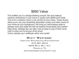 This entitles you to a design/clothing consult, hair and makeup, newborn photoshoot in your home or studio and a $500 print credit! This is for a newborn shoot in the comfort of your home. These shoots allow you to use your beautifully decorated nursery and other rooms of your home as your background. We bring our hair/makeup artist to pamper mom and make her feel her best for those family and mother/baby shots. Siblings also are more at ease to play in their home until it is their turn to be part of the shoot! Call to validate your certificate within one month!