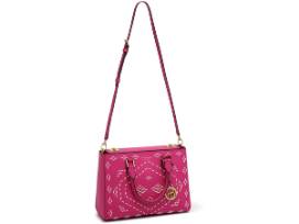 Bold in pattern, texture, and color, the West 57th Woven Stitch Turnlock Satchel is all mod and moxie. Crafted with fine saffiano leather and a unique double turnlock closure, this must-have luxury handbag features a spacious interior with multiple pockets, custom Bendel hardware and feet, as well as an adjustable crossbody strap for versatile carrying.