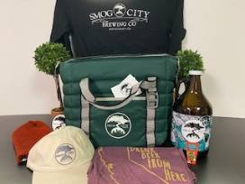 The Smog City swag bag contains a $25.00 gift card, growler, knit hat, ball cap, ladies t-shirt, man's long sleeve t-shirt, and bottle opener.