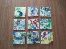 The children & teachers stepped into 5 different colors of paint then walked & danced around onto a large white canvas. Then Ms B. & Nicola picked out several parts of it that make good art pieces. Next each art canvas piece was mounted to a square wood piece to give it more dimension. The last step was to frame around each one then put them (6-8pcs)together as one art piece then frame all around it!