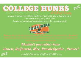 Cluttered environments promote mental clutter! Let us help you support your growing minds with a clean, clear space to study or play - College HUNKS is an HONEST/UNIFORMED/NICE/KNOWLEDGEABLE/ SERVICE that is easy to use, earth friendly and stress free. Just show us what to remove and we will donate or recycle everything possible. Your job will help feed two hungry children through our partnership with Feeding Children Everywhere. Expires 5/2020.