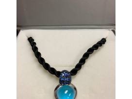This gorgeous piece is made with an 18-karat gold pendant set with one blue topaz and a clip ball made of blue sapphires, all on a black silk cord.