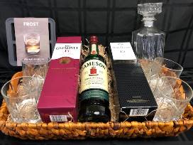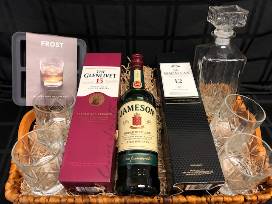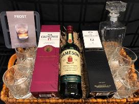 Enjoy this basket filled with fine Scotch and Irish Whiskey. Glenlivet 15, Macallan 12, and Jameson Whiskey will make any bar complete. You will also receive a Glass Decanter and 4 beautiful High Ball Glasses. Don't forget the ice cubes to make your sipping complete!