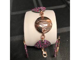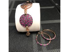 Wear this unique Guess? Rose Gold disc bracelet with Raspberry Colored Gems and matching Earrings that can serve as a conversation piece and add that pop of color to your outfit!