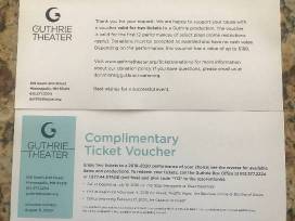 The 2 Tickets to a Guthrie Production (plays include both Cabaret and Sweat). See tickets and calendar for details. Although these were for the 2019-2020 season, due to COVID, the Guthrie will honor them through the 2021 season.
