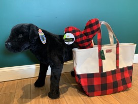 Giant black lab and an LL Bean Boat & Tote bag full of dog and cat toys, treats and a $50 gift card to PetSmart.